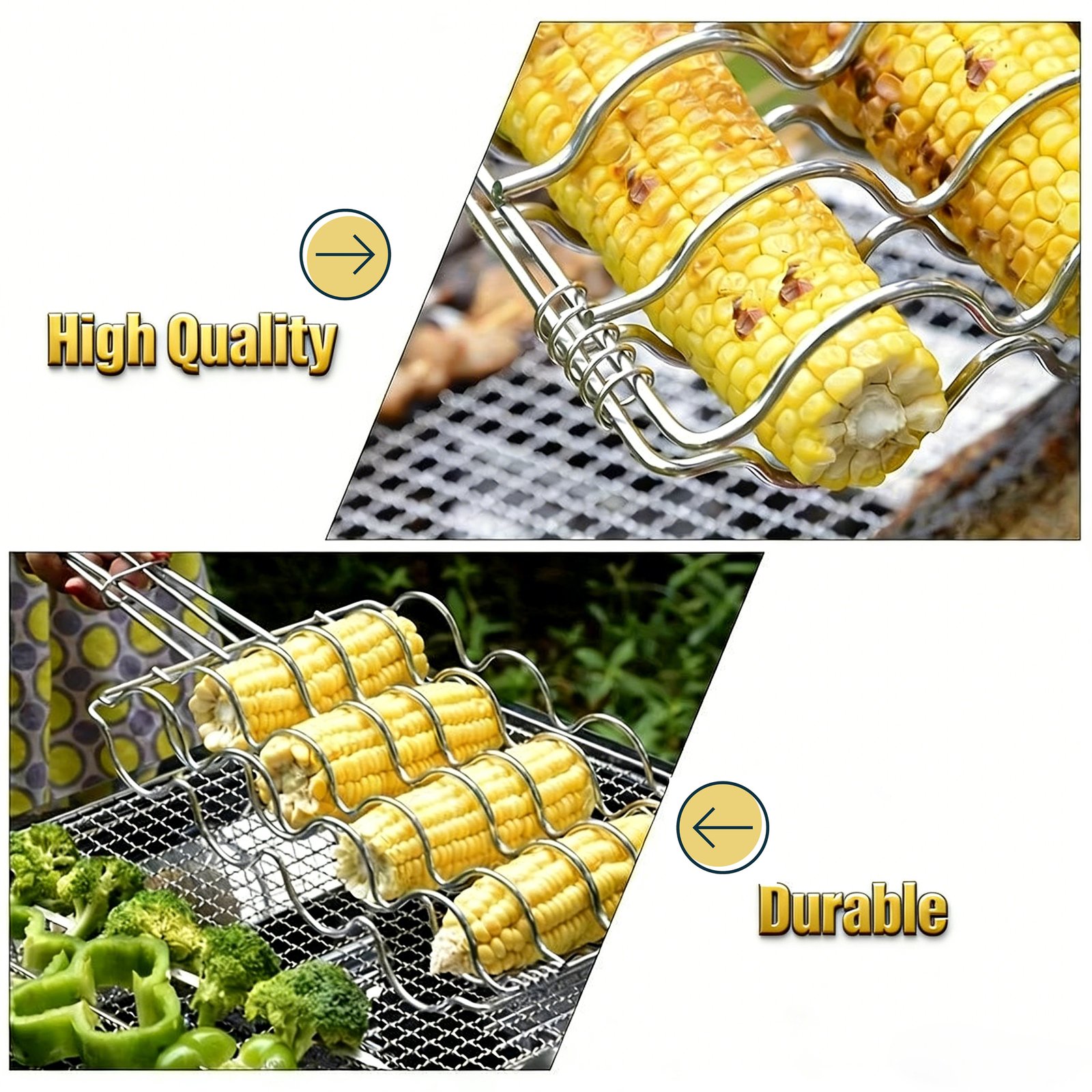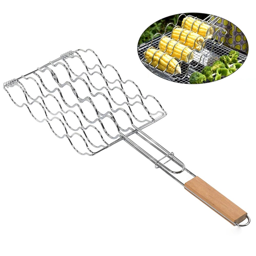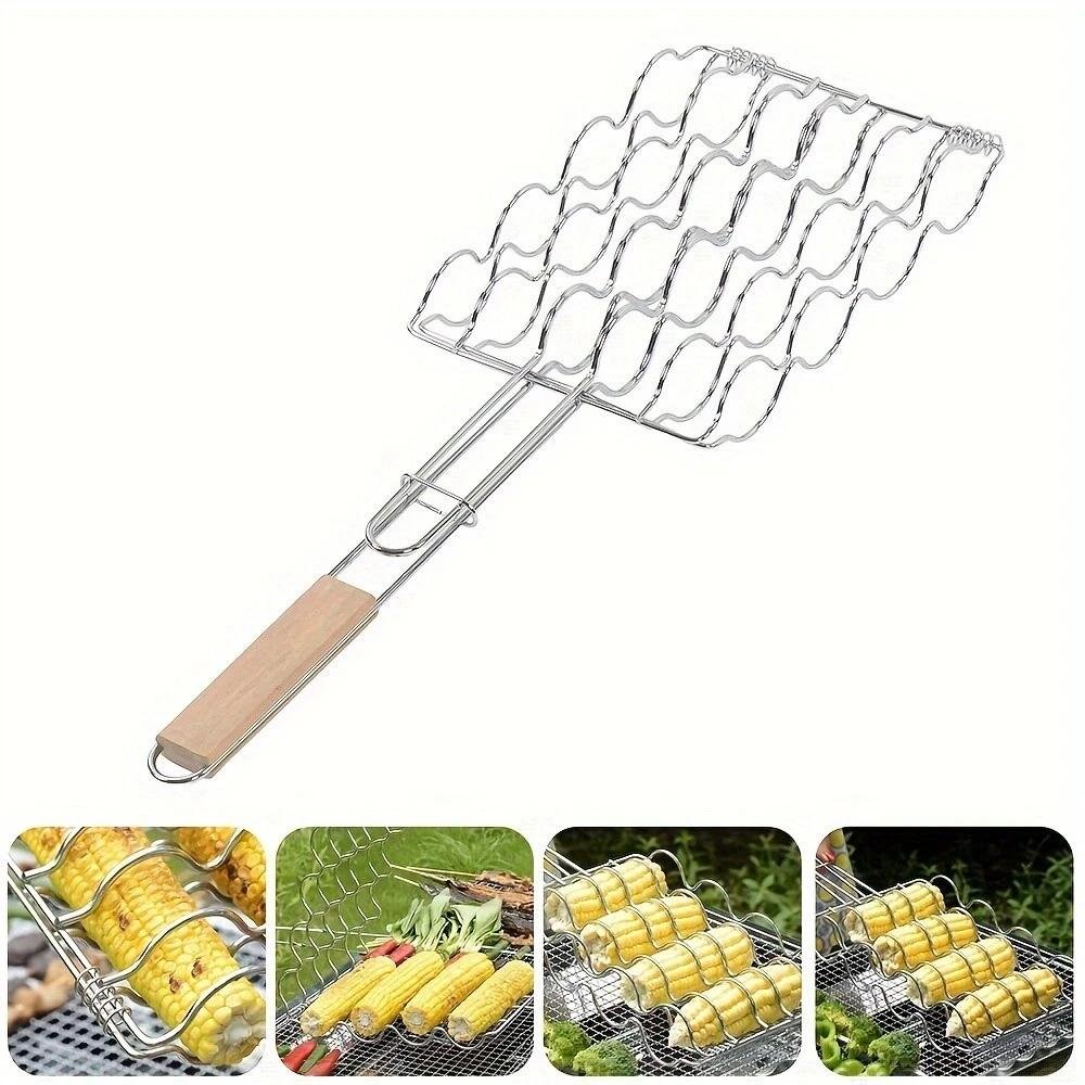 This heavy-duty corn grill basket is made of food-grade 430 stainless steel and wooden handle, it securely holds up to 4 corns at once, ensuring even, charred results without mess or corn falling through grates.