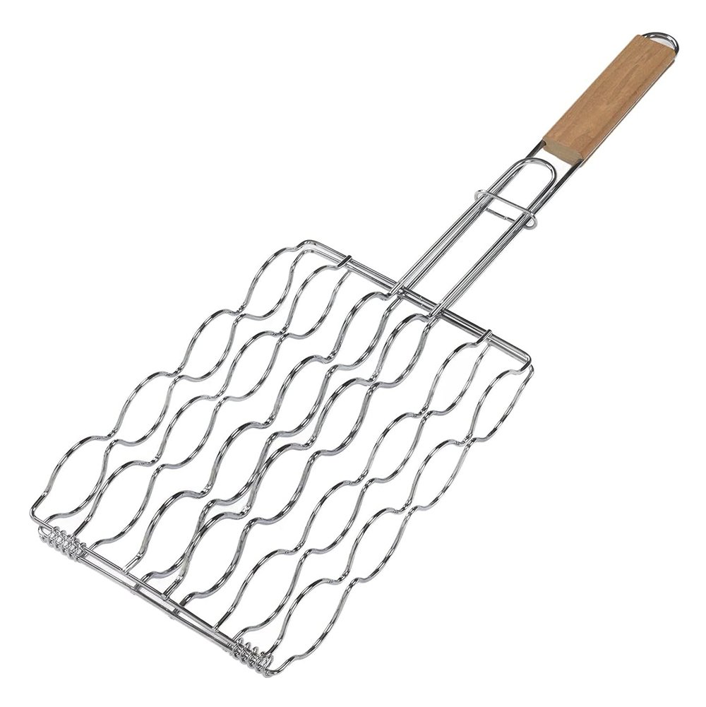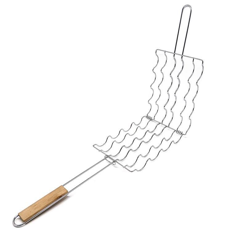 This commercial-grade 4-corn BBQ grill basket is stainless steel construction with heat-resistant wooden handle, stackable design. Ideal for catering, restaurants, and bulk grilling operations.